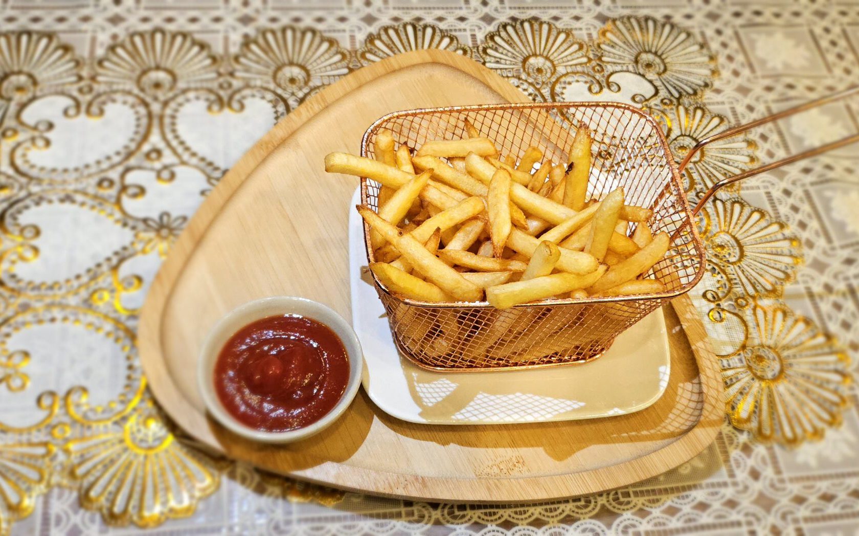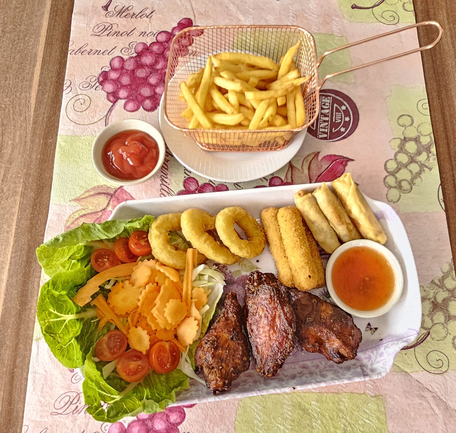 4 Chicken Wings, 3 Mozzarella Sticks, 3 Tintenfischringe, 3 Frühlingsrollen, Pommes Frites - €14.87